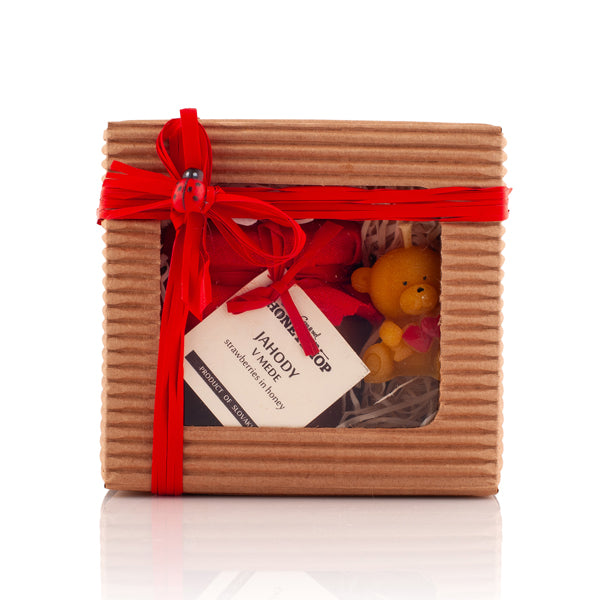 OBSAH BALÍČKA: Medová mňamka jahoda 120g (zloženie: med 97 %, jahody 3 %), sviečka zo včelieho vosku 7g