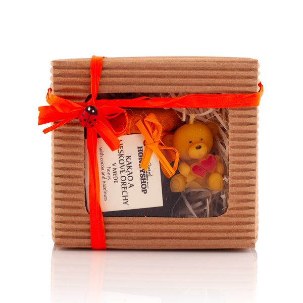 OBSAH BALÍČKA: Medová mňamka kakao-lieskovce 120g (zloženie: med 91%, lieskovce 6%, kakao (kakaový prášok, regulátor kyslosti: uhličitan draselný) 3%), sviečka zo včelieho vosku 7g