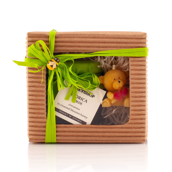OBSAH BALÍČKA: Medová mňamka škoricová 120g (zloženie: med 98 %, škorica 2 %), sviečka zo včelieho vosku 7g