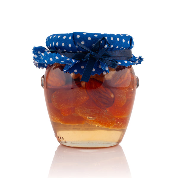 ZLOŽENIE: agátový med, sušené marhule (marhule, konzervant: oxid siričitý) 12%, mandle 8%, vlašské orechy 8%